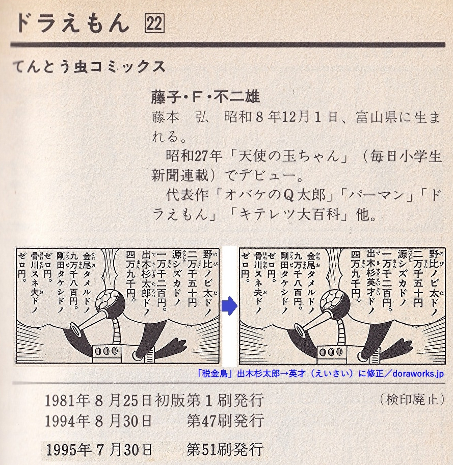 その後、「太郎」とされていた「税金鳥」についても、てんとう虫コミックスの増刷版などで「出木杉英才」に修正され設定が完全に統一されました。ルビは「えいさい」です。